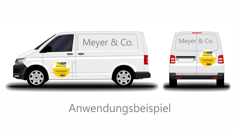 Attraktive Rekrutierung leicht gemacht!Sie sind auf der Suche nach neuen Mitarbeitern? Mit unserem hochwertigen Aufkleber „Mitarbeiter gesucht“ ziehen Sie die richtigen Talente direkt an! Unsere runden Klebefolien sind in den Größen 30 cm, 42 cm und 61 cm erhältlich und einzigartig gestaltet, um die Sichtbarkeit Ihrer Stellenausschreibung zu maximieren.Wetterfest, UV-stabil und vielseitig einsetzbarEgal, ob in Ihrem Schaufenster, an glatten Wänden oder sogar auf Fahrzeugen – unsere Aufkleber sind der perfekte Blickfang für alle, die nach neuen Herausforderungen suchen. Dank der wetterfesten und UV-stabilen Eigenschaften bleiben die Farben auch bei wechselhaftem Wetter und direkter Sonneneinstrahlung lebendig und ansprechend.Einfache HandhabungDie Anwendung ist kinderleicht: Die Aufkleber lassen sich problemlos selbst anbringen und sind ebenso einfach wieder zu entfernen, ohne Rückstände zu hinterlassen. Das bedeutet für Sie: Flexibilität und Anpassungsfähigkeit, wann immer Sie sie benötigen!Individuelle GestaltungNutzen Sie die Möglichkeit, Ihre Marke zu präsentieren! Auf Wunsch können wir Ihr Logo kostenfrei in den Aufkleber integrieren – ein zusätzlicher Pluspunkt, um die Aufmerksamkeit potenzieller Mitarbeiter auf Ihr Unternehmen zu lenken.Günstig und schnellProfitieren Sie von kurzen Lieferzeiten und einem ausgezeichneten Preis-Leistungs-Verhältnis. Unsere Aufkleber sind eine kosteneffiziente Lösung, um schnell auf Ihre offenen Stellen aufmerksam zu machen und den perfekten Kandidaten zu finden.Unser Tipp: Durch temporäre Verklebung auf Fahrzeugen sind Sie auch mobil im Recruiting und erreichen somit eine noch größere Zielgruppe!Setzen Sie auf Sichtbarkeit und Kreativität! Bestellen Sie jetzt Ihre „Mitarbeiter gesucht“-Aufkleber und bringen Sie frischen Wind in Ihre Rekrutierungsmaßnahmen!