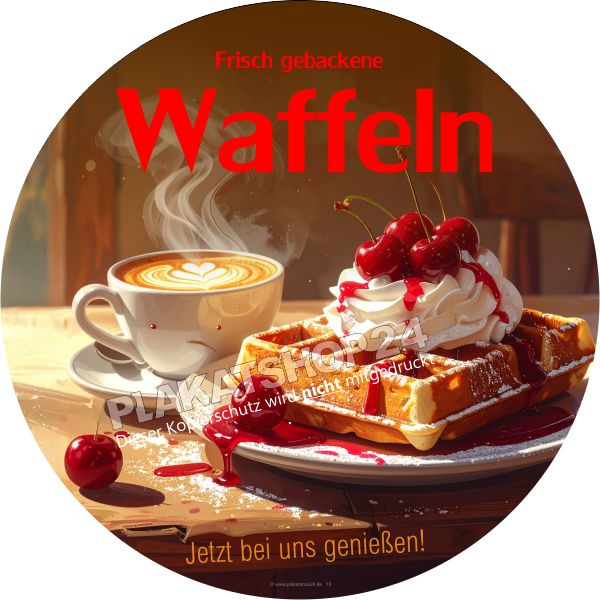 Machen Sie Passanten zu Kunden! Mit unserem runden Aufkleber „Frische Waffeln mit Kirschen und Sahne“ schaffen Sie eine unwiderstehliche visuelle Anziehungskraft. Das appetitliche Motiv weckt sofort die Lust auf eine süße Pause und lenkt alle Blicke auf Ihr Café oder Eiscafé.