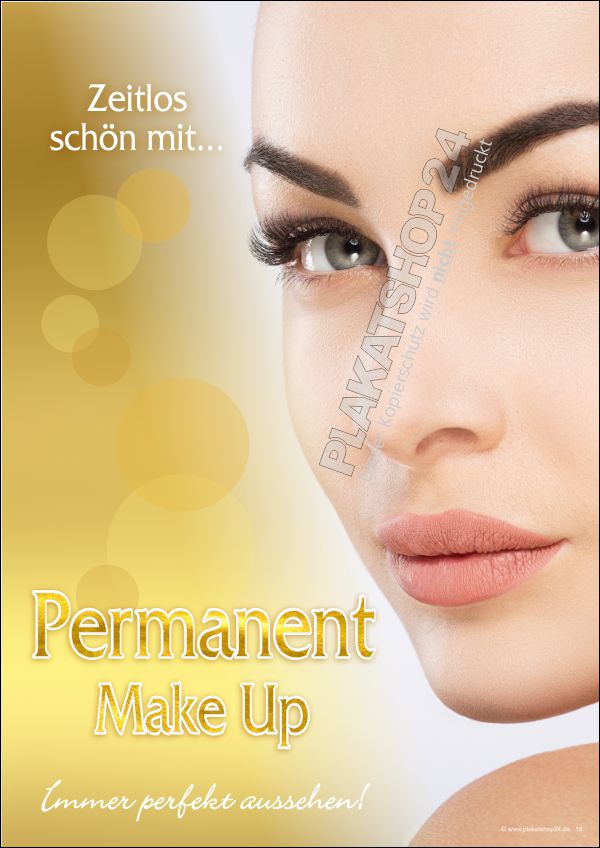 Werbeposter für Ihr Kosmetikstudio speziell für die dekorative Kosmetik Permanent Make-up. Dauerhafter Lidstrich, betonte Augenbrauen dank kosmetischer Tätowierung, die Konturen der Lippen verstärken, das sind die Hauptanwendungsbereich dieser Dienstleistung. Dieser Bereich der Gesichtspflege bringt Ihnen natürlich Umsatz und deshalb sollten Sie nicht bei der Werbung sparen! Das Kosmetikplakat eignet sich auch hervorragend für Ihre Behandlungsräume oder dem Wartebereich. Einfach mal das Bildmaterial wirken lassen und schon wird das Interesse geweckt. Sie werden es an den Nachfragen und den Beratungsterminen merken! Diese Plakatvorlage liefern wir in verschiedenen Größen und Materialien. Da wir immer erst drucken, nachdem Ihre Bestellung eingegangen ist, kann jedes Plakatmotiv nach Ihren Wünschen geändert werden.