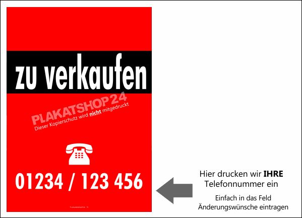 Produktinformationen "Plakat Zu verkaufen mit Eindruck Ihrer Telefon-Nummer"