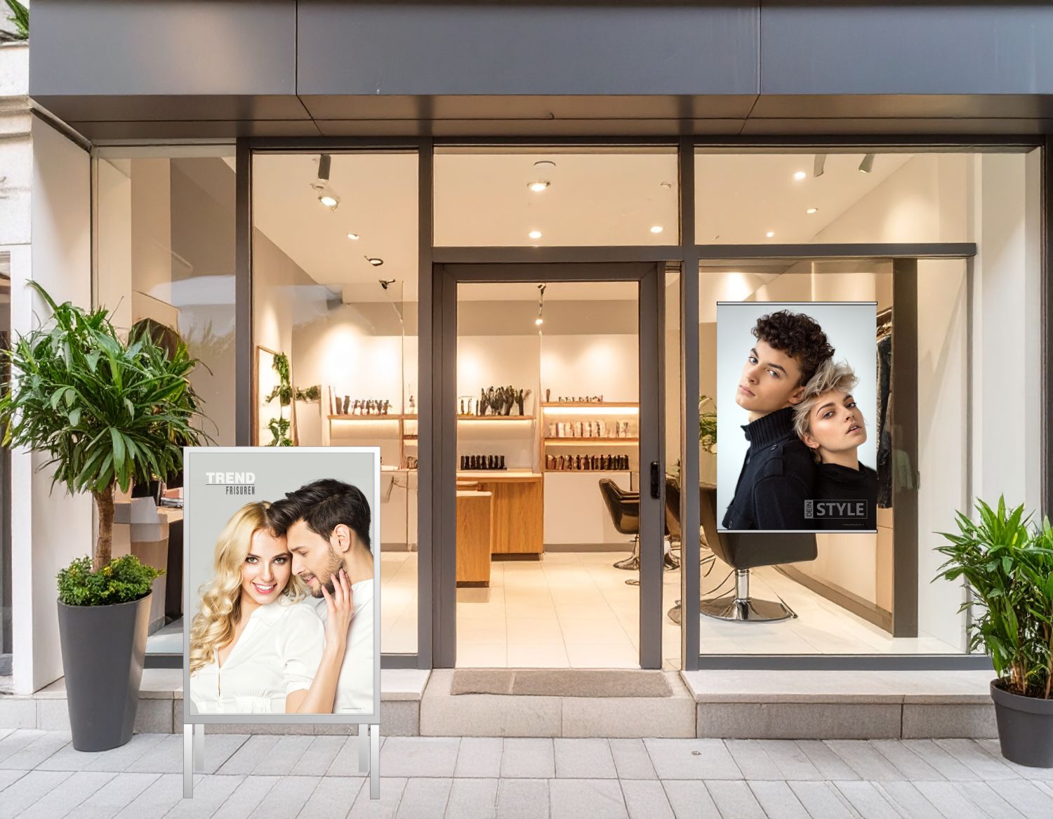 Beginnen wir mit dem Umfeld Ihres Geschäftes. Wichtig ist ein für Ihr Unternehmen passender Mix aus Außen- und Innenwerbung. Der Werbe-Klassiker schlechthin ist nach wie vor der Plakatständer, den Sie mit aktuellen Frisurenpostern bestücken sollten. Sie haben besonders viel Platz vor Ihrem Haarstudio? Dann empfehlen wir den Einsatz von A0-Kundenstoppern, die durch Ihre Größe eine hervorragende Werbewirkung erzielen. Auch Stehfahnen und Stockfahnen eignen sich bestens für das Umfeld Ihres Salons. Bedruckt mit Ihrer individuellen Friseur-Werbung sowie durch ständige Bewegung im Wind werden diese Werbemittel zu einem tollen Blickfang.