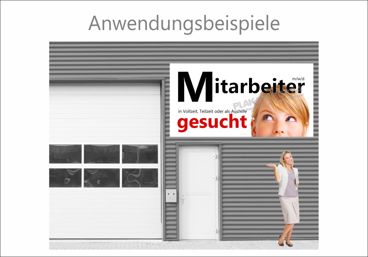 Steigern Sie die Sichtbarkeit Ihrer Stellenangebote mit unserem hochwertigen Werbebanner „Mitarbeiter in Voll- oder Teilzeit gesucht“. Dieses vielseitige Banner ist die optimale Lösung für Unternehmen aller Branchen, die schnell und effektiv neue Talente gewinnen möchten.Produktmerkmale: Vielseitige Materialwahl: Entscheiden Sie sich für langlebiges PVC, erhältlich mit oder ohne Ösen für eine unkomplizierte Montage, oder nutzen Sie die elegante Klebefolie für glatte Oberflächen – ganz nach Ihren individuellen Anforderungen. Wetterfest und UV-stabil: Unser Banner trotzt jedem Wetter! Dank seiner wetterfesten und UV-stabilen Eigenschaften bleibt es auch bei Regen und Sonnenschein in perfektem Zustand, damit Ihre Botschaft immer sichtbar bleibt. Diverse Größenoptionen: Egal, ob Sie ein großes Statement setzen oder gezielt auf Ihr Angebot hinweisen möchten – wählen Sie die passende Größe für Ihre Bedürfnisse, um maximale Aufmerksamkeit zu erzielen. Individuelle Gestaltungsmöglichkeiten: Wir bieten Ihnen die Möglichkeit, Ihr Firmenlogo kostenfrei auf das Banner drucken zu lassen. So präsentieren Sie Ihre Marke professionell und einheitlich. Ideal für den Außenbereich: Nutzen Sie alle Möglichkeiten, um Ihr Banner an Fassaden, Zäunen oder Mauern zu platzieren. So erreichen Sie potenzielle Bewerber direkt an den Orten, wo sie sich aufhalten. Kosteneffizient und schnelle Lieferung: Profitieren Sie von einem hervorragenden Preis-Leistungs-Verhältnis und einer kurzen Lieferzeit, um zeitnah auf Personalengpässe reagieren zu können. Erhöhen Sie Ihre Chancen, die besten Mitarbeiter für Ihr Unternehmen zu gewinnen, mit unserem ansprechenden Werbebanner „Mitarbeiter in Voll- oder Teilzeit gesucht“. Starten Sie jetzt Ihre Recruiting-Offensive und machen Sie Ihre Stellenanzeigen unübersehbar – für eine erfolgreiche Mitarbeitergewinnung!