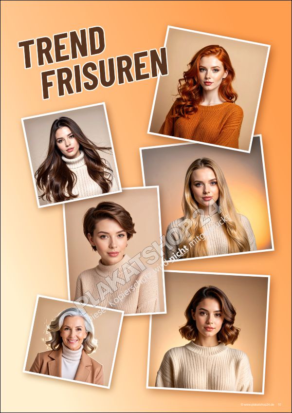 Du willst deine Salon-Trendfrisuren auf einen Blick präsentieren? Mit unserer Trend Frisuren Kollage zeigst du gleich mehrere Styles auf einem Poster – kreativ, ansprechend und aufmerksamkeitsstark! Ideal für Friseursalons, die ihre Kunden sofort inspirieren wollen.