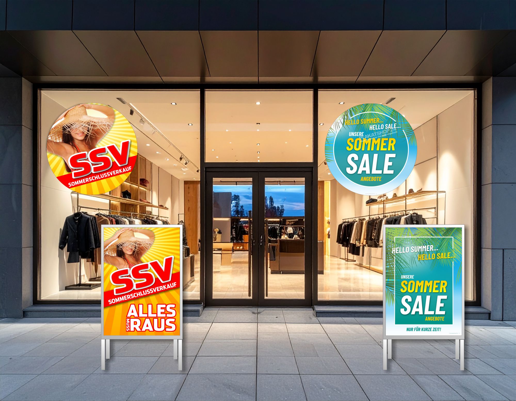 Werbeplakate: Farbenfrohe Poster für Kundenstopper und Verkaufsflächen, die Ihre Sommer-Angebote unübersehbar kommunizieren. Werbebanner: Hochwertige Banner in verschiedenen Formaten, die für eine weithin sichtbare Sale-Botschaft am Point of Sale sorgen. Schaufensterfolien: Leicht anzubringende Klebefolien mit sommerlichen Motiven für eine attraktive und professionelle Schaufensterfront.